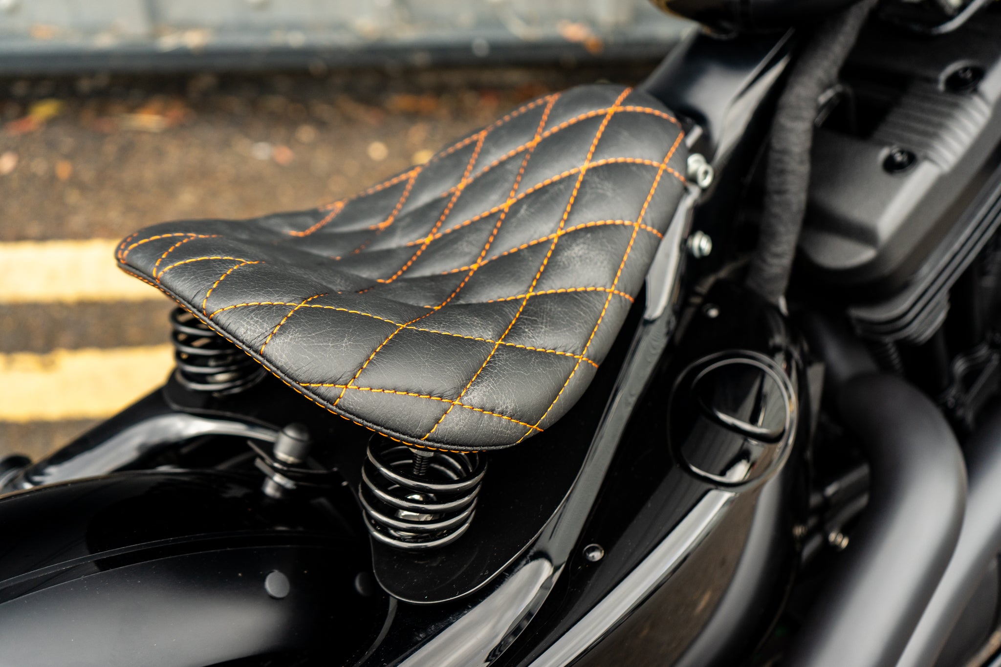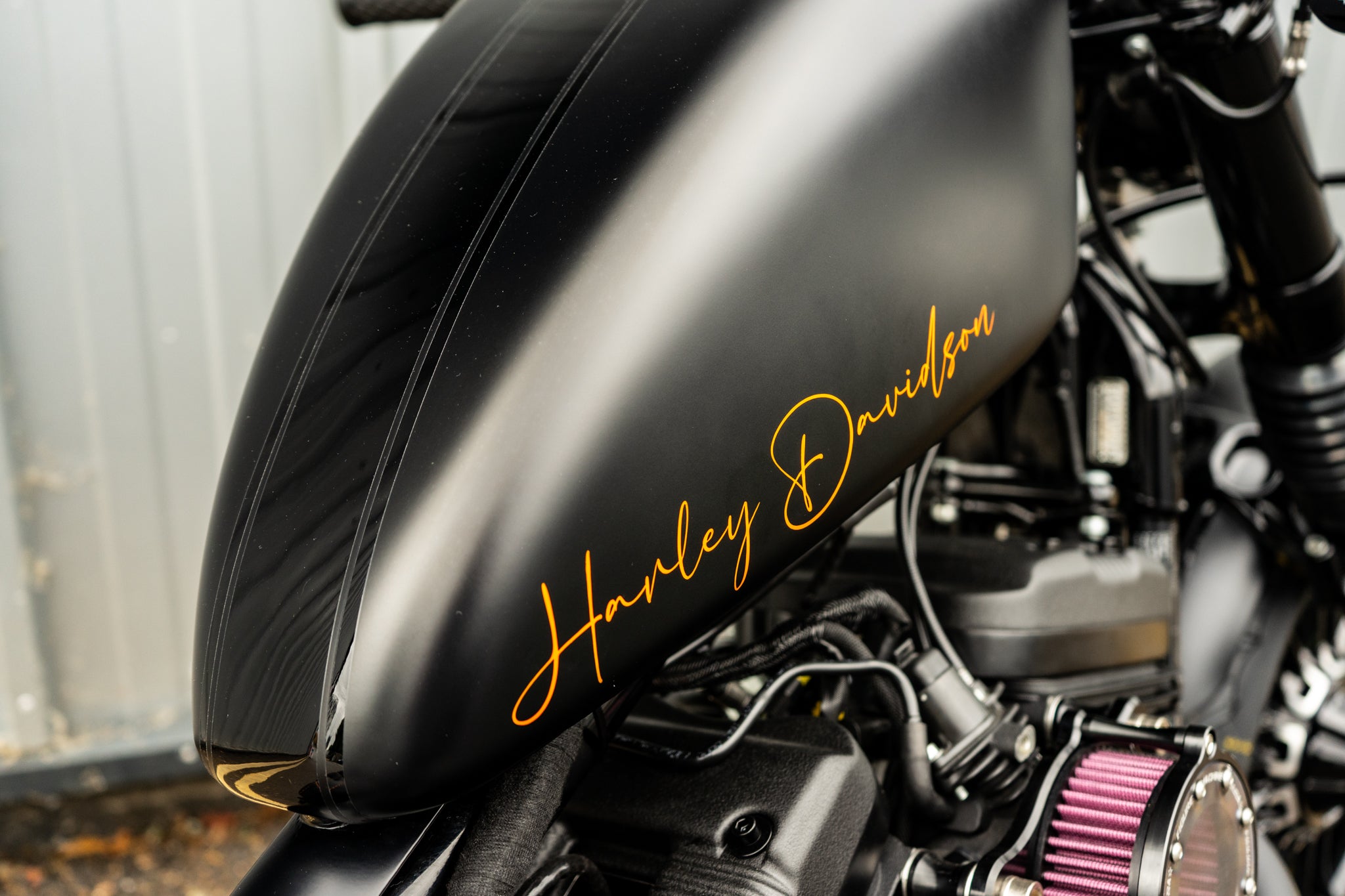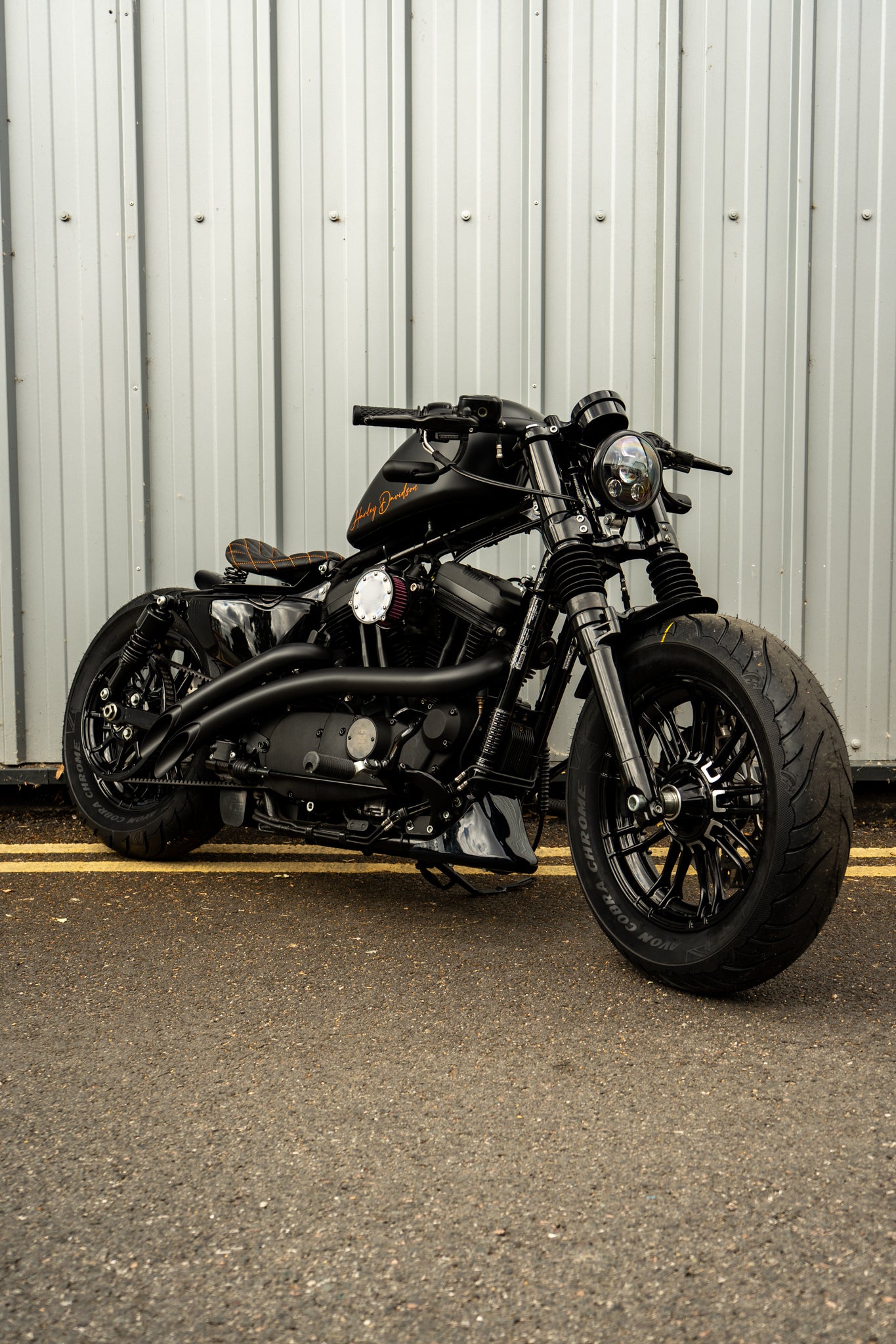 Custom built Harley Sportster 48 Bobber - Full engine blackout with top specification, Matt black with Orange signature and contrast Matt lines sets this bike apart. This is one of our higher spec builds.